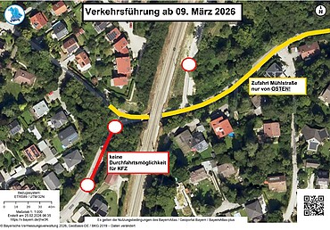Ab Montag, den 9. März 2026 ist die Vollsperrung wieder eingerichtet. Ab dann ist die Zufahrt zur Mühlstraße NUR VON OSTEN MÖGLICH! Diese Verkehrsführung wird voraussichtlich mehrere Wochen dauern. Hierfür wird eine Fahrspur (siehe gelbe Markierung im Lageplan) zur Durchfahrt durch das Brückenbauwerk von Osten kommend bis zur Mühlstraße und umgekehrt offengehalten.